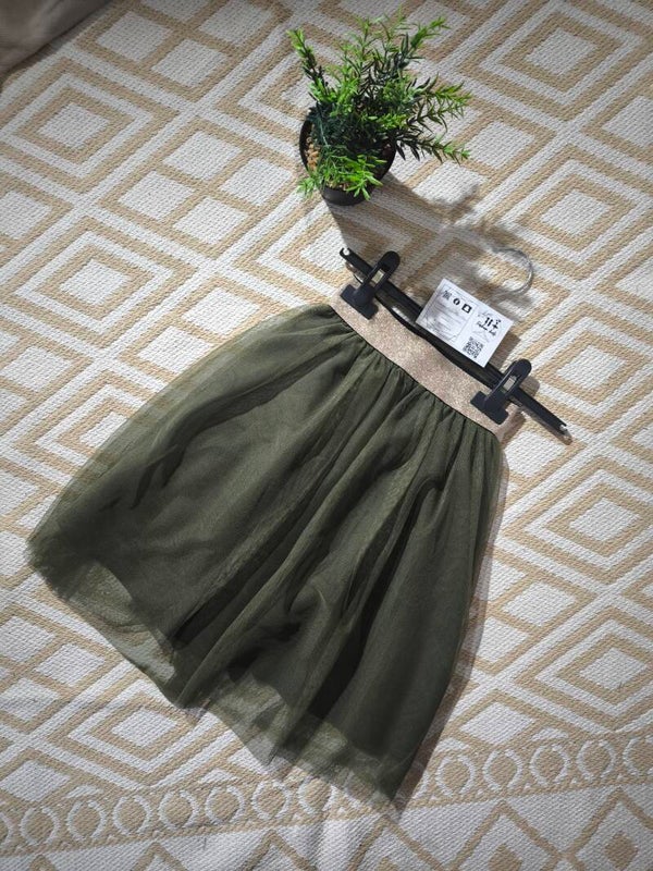 Superbe jupe en tulle doublée avec une ceinture dorée élastique à la taille.