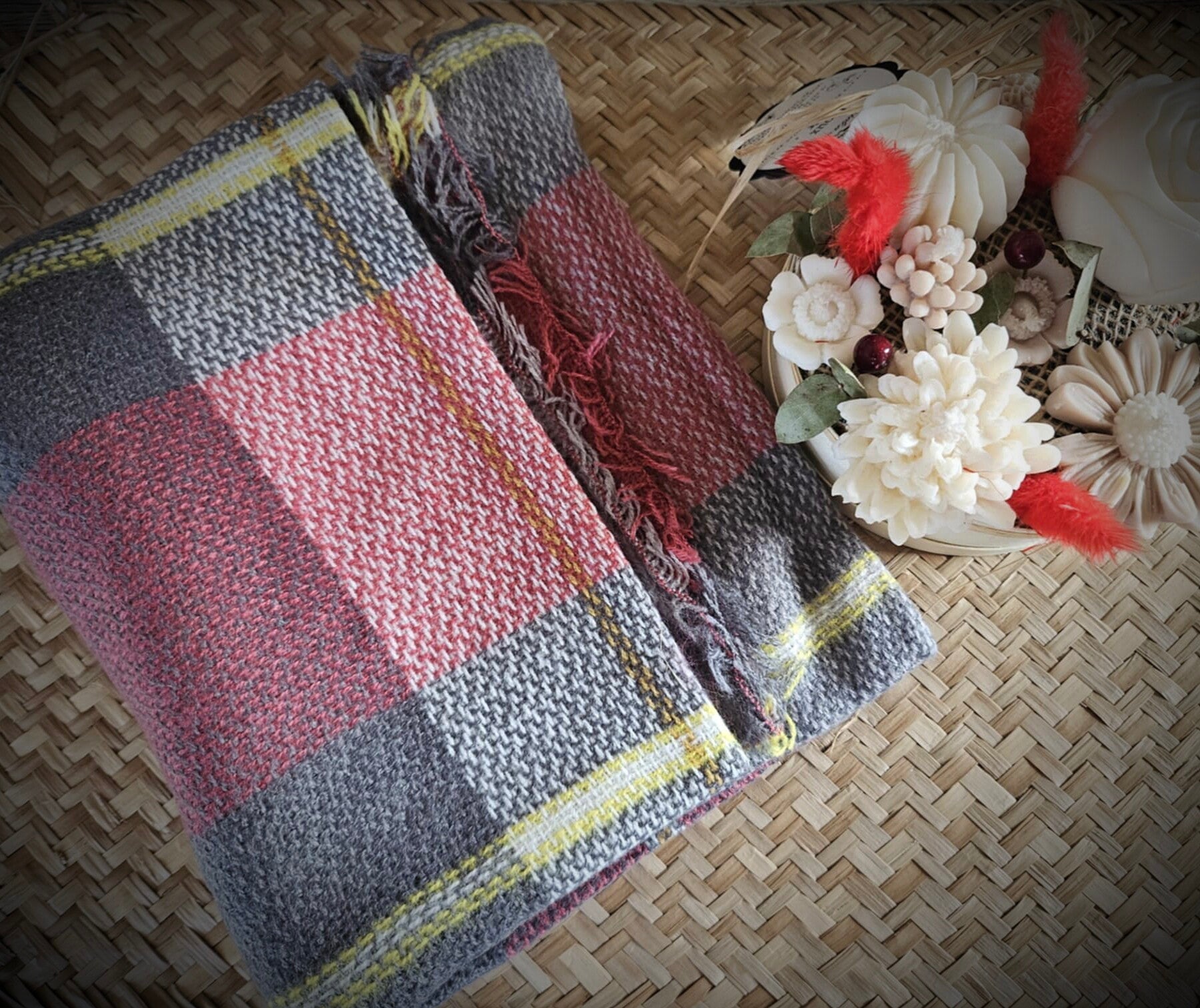 Écharpe majoritairement grise à carreaux avec des couleurs jaune et un peu rouge bordeaux forme carrée .