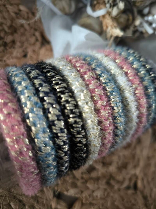 Bracelet élastiques en moumoute qui n' habîme pas les cheveux pratique et pourquoi ne pas joindre l' Utile a l' agréable 😉, (inspiré des knekki. )